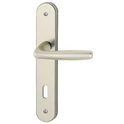 Ensemble Roissy, entraxe EA 70 mm, entraxe de fixation 195 mm. Fourni avec vis et tige carrée de 7 mm. Plaque de 240 x 40 mm. Saillie de la béquille : 53 mm. Trou de clé I, alu anodisé champagne, Trou de clé I