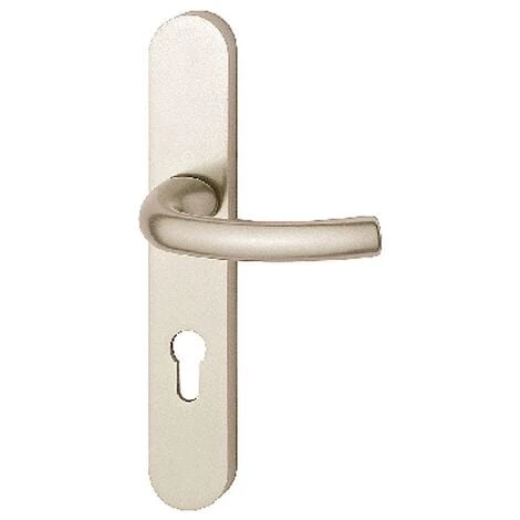 Ensemble Tokyo fourni avec vis et carrée de 7 mm, grande plaque de 234 x 38 mm. EA 70 mm, entraxe de fixation 195 mm, saillie 64 mm. Trou de clé I pour épaisseur de porte 53 à 57 mm, alu anodisé champagne, Trou de clé I pour épaisseur de porte 53 à 57 mm