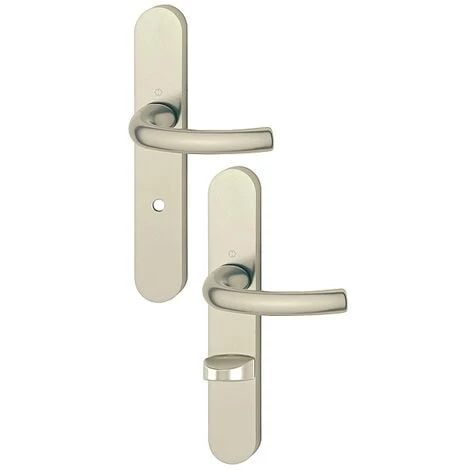 Ensemble Tokyo fourni avec vis et carrée de 7 mm, grande plaque de 234 x 38 mm. EA 70 mm, entraxe de fixation 195 mm, saillie 64 mm. A condamnation sans voyant, alu anodisé champagne, A condamnation sans voyant