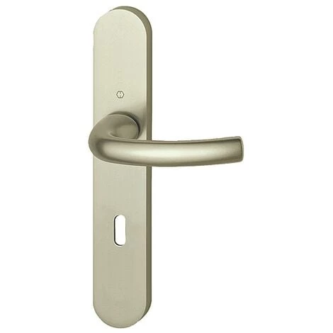 Ensemble Tokyo fourni avec vis et carrée de 7 mm, grande plaque de 234 x 38 mm. EA 70 mm, entraxe de fixation 195 mm, saillie 64 mm. Trou de clé L, alu anodisé champagne, Trou de clé L