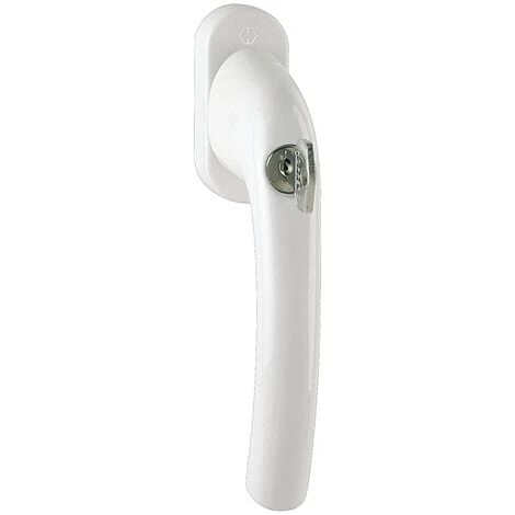 Poignée de fenêtre montée sur platine, entraxe des trous 43 mm, carré de 7 mm. A condamnation par clé s’entrouvrant avec tige carrée. Tokyo blanc 9010, sans vis, Tokyo blanc 9010 à condamnation par clé, carré dépassant 7 x 35 mm, vis 5 x 45 mm