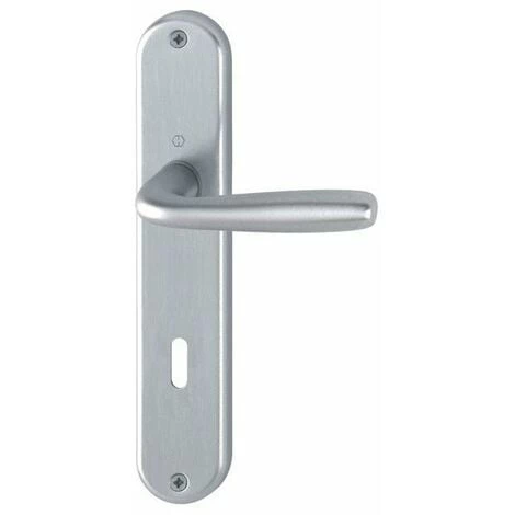 Garniture en aluminium sur plaques longues, pour portes intérieures. Pour entraxe de serrure de 70 mm. – entraxe 195 mm, plaque 215 x 41 mm Finition : aspect chromé